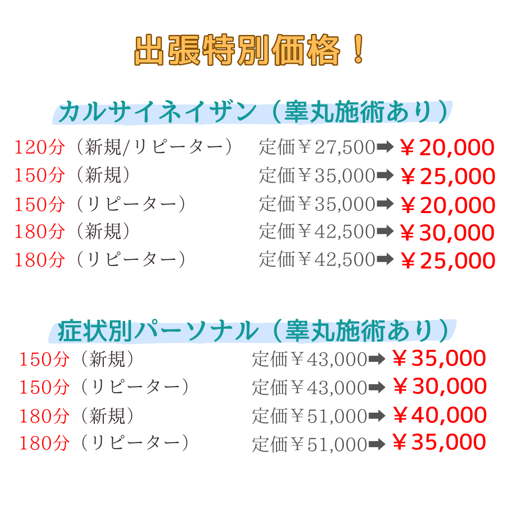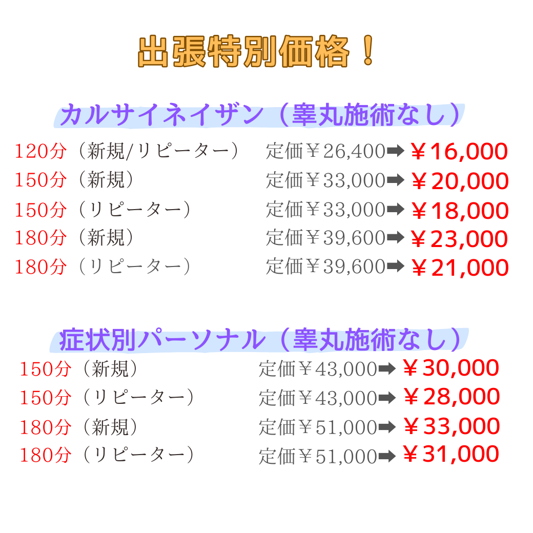 ・ビジネスホテル・ファッションホテル等への出張施術:睾丸への施術が可能です。